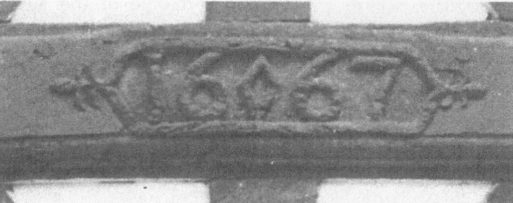 …removing the plaster over the shop windows a beautiful pattern in black oak was found arranged in diamond and oval. The wood was in good preservation and has been carefully restored to its original position the spaces between being filled with cement covered with white plaster … the original carving(s) of date and initials were found on the old timber and are now in a conspicuous place on the front of the house.